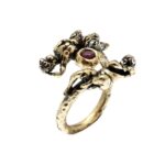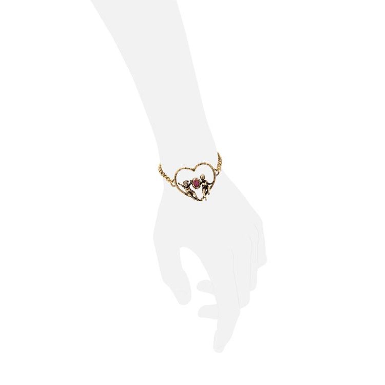 Gilded brass bracelet with a central heart on which an angel and a devil are seated holding an oval ruby. Unique bijoux made entirely by hand with artisanal techniques. Central size H 3cm L 4cm