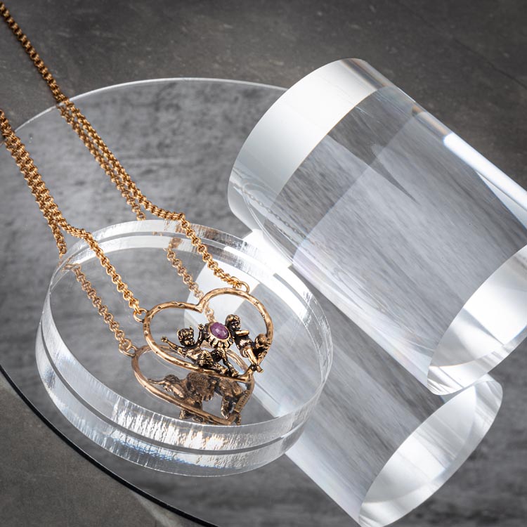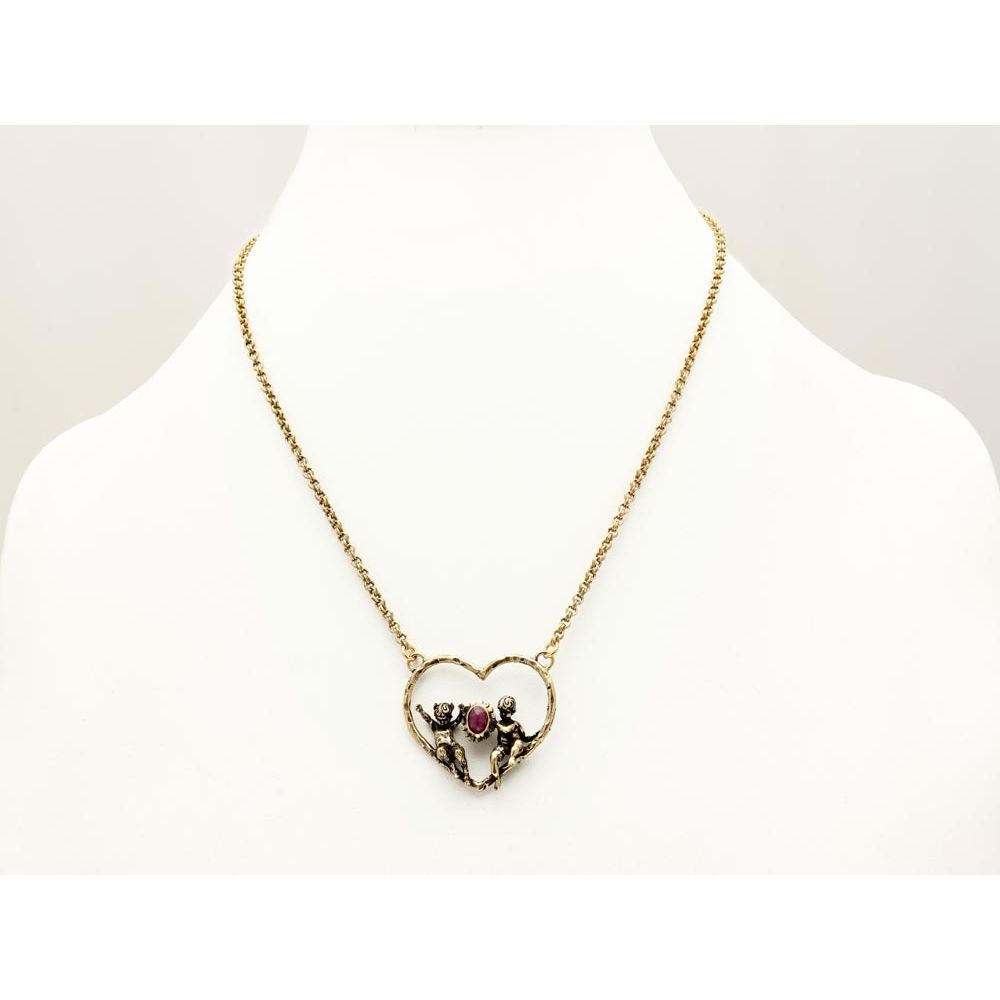 Entirely handmade necklace features a central heart on which an angel and a devil are seated, maintaining an oval ruby ​​setting. Unique bijoux made entirely by hand with artisanal techniques. Central dimension H 3cm L 3.3cm Chain 50cm