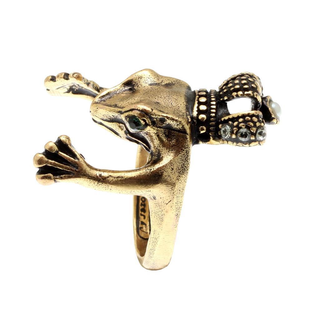 Ring made of gold-dipped brass with emerald-eyed frog and crown embellished with swarovski and pearl. A piece of jewelry with a classic taste suitable for all ages, made entirely by hand by our artisans.