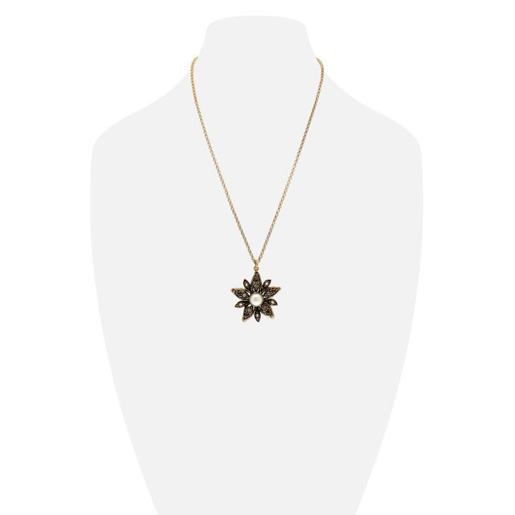 Golden brass necklace with pearl pistil flower and petals decorated with garnets and swarovski. Handmade jewel to adorn the neck. Dimension H 3.5cm L 3.3cm Chain 50cm.